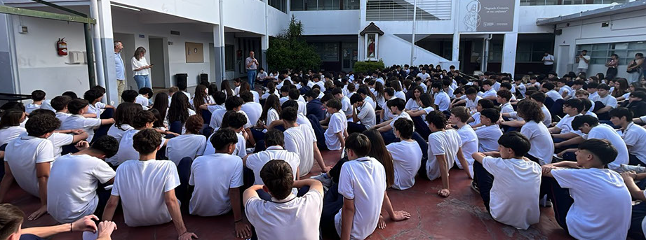 A media mañana y media tarde, para cerrar este primer día de clases recibimos a los cursos de término, nuestros alumnos más grandes, hicimos con ellos y las familias que nos acompañaron, una oración a cargo de Juan Faella que los invitó a poner en valor su realidad, el poder estar ahí, con sus compañeros, sus familias y pudiendo empezar a transitar este último año del nivel secundario. Juan puso el acento en llenar este año de gestos y momentos que queden como recuerdo de un transitar la escuela, de haber crecido en la fé y haber pasado de ser esos niños y niñas de 12 años que llegaron, a estos jóvenes que son hoy.
